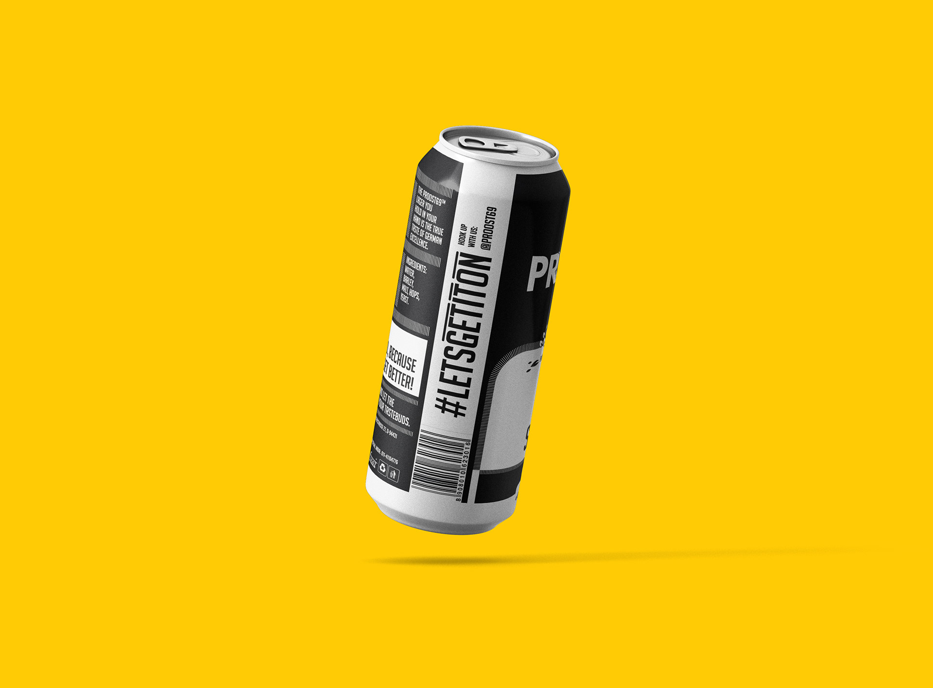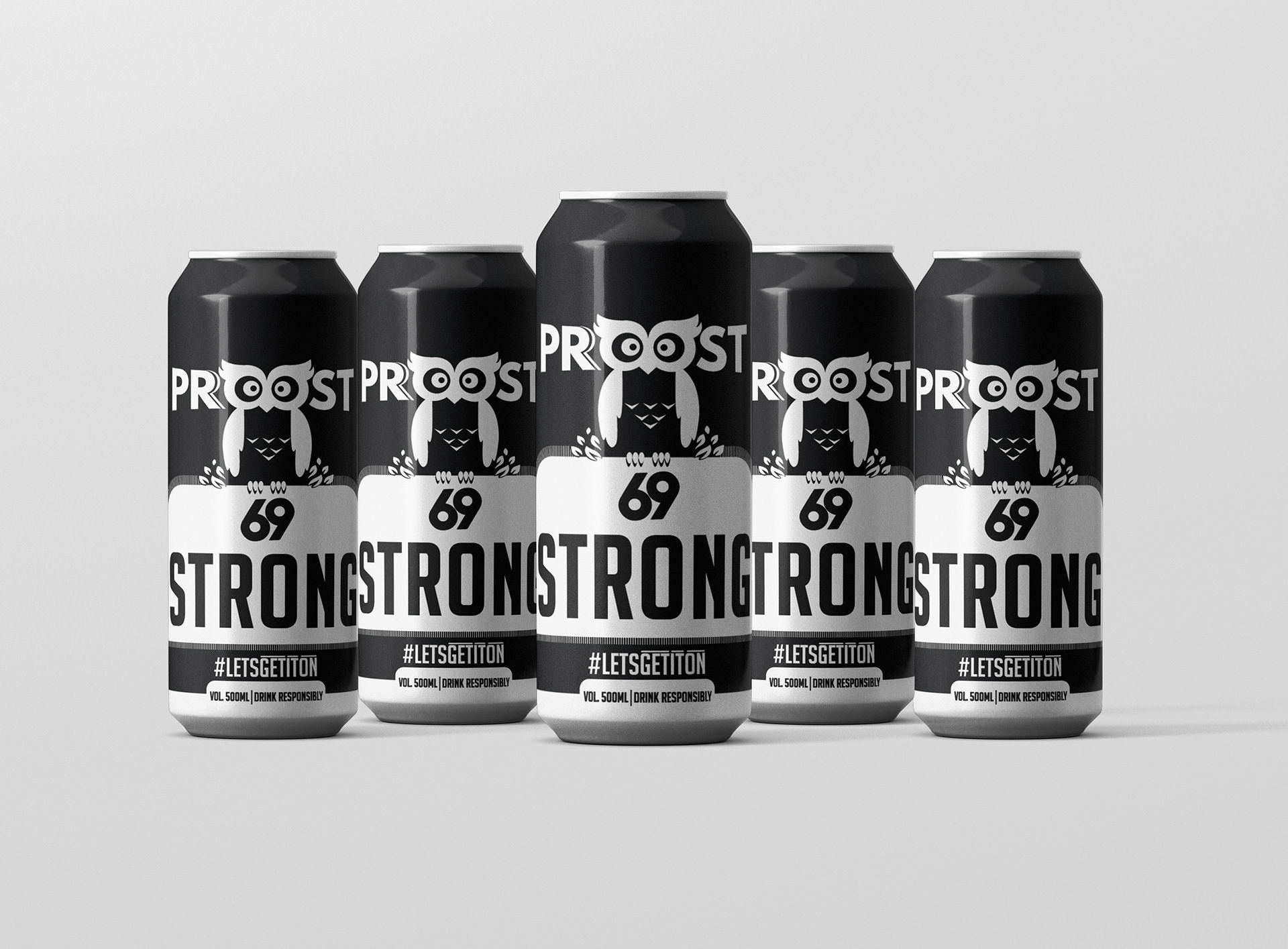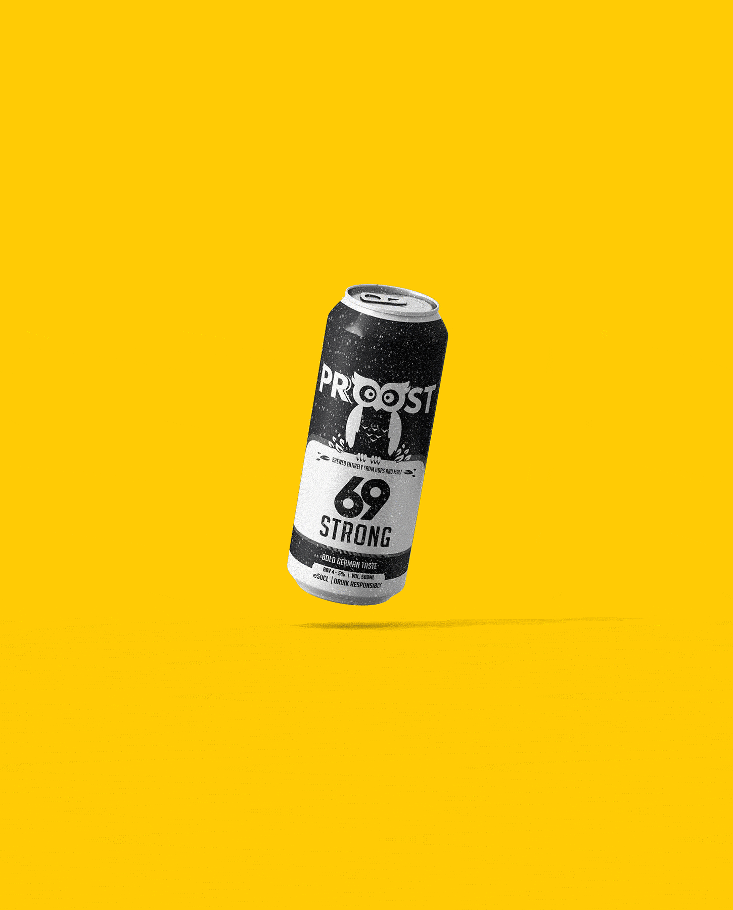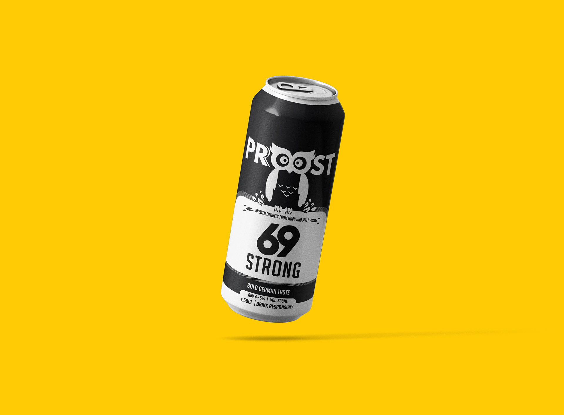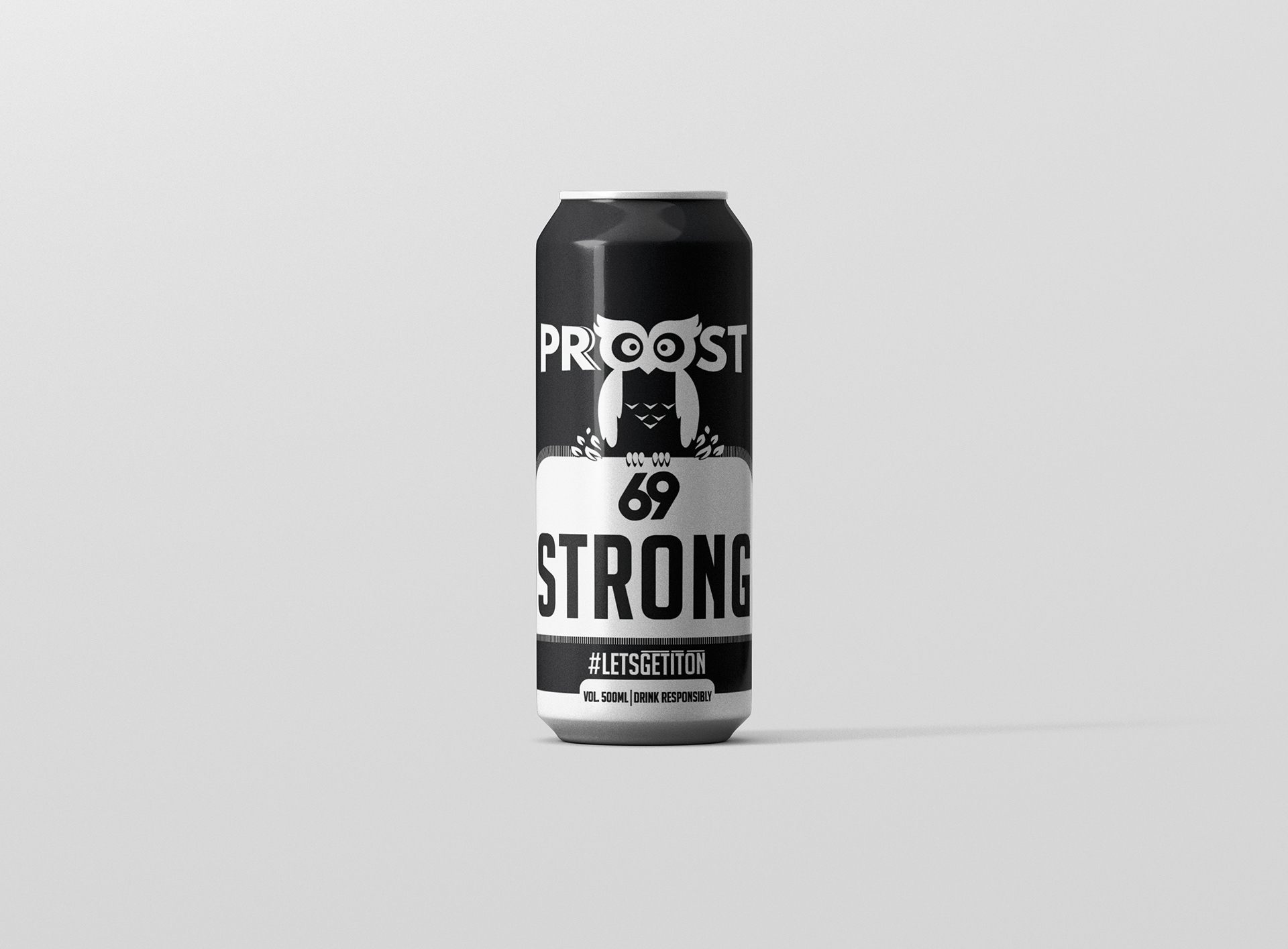 Proost 69 Strong Lager can packaging design. A Spanish Brew marketed in India.